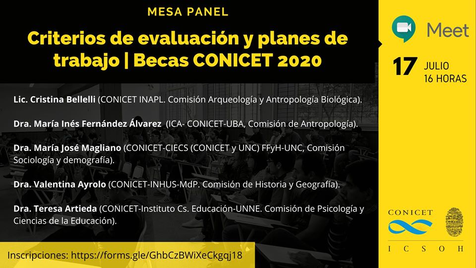 El ICSOH CONICET/UNSa, perteneciente a la CCT Salta-Jujuy, organiza la Mesa Panel "Criterios de evaluación y planes de trabajo.Convocatoria a Becas CONICET 2020" . La actividad tiene por objetivos brindar información general sobre la presentación a becas internas doctorales, finalización de carrera y postdoctorales en el área de Ciencias Sociales y Humanidades, responder inquietudes sobre criterios de evaluación y formulación de planes de trabajo, de acuerdo al funcionamiento de las comisión evaluadoras disciplinares. Asimismo se ofrecerá asesoramiento y orientación a los y las interesados/as en postularse a becas CONICET.