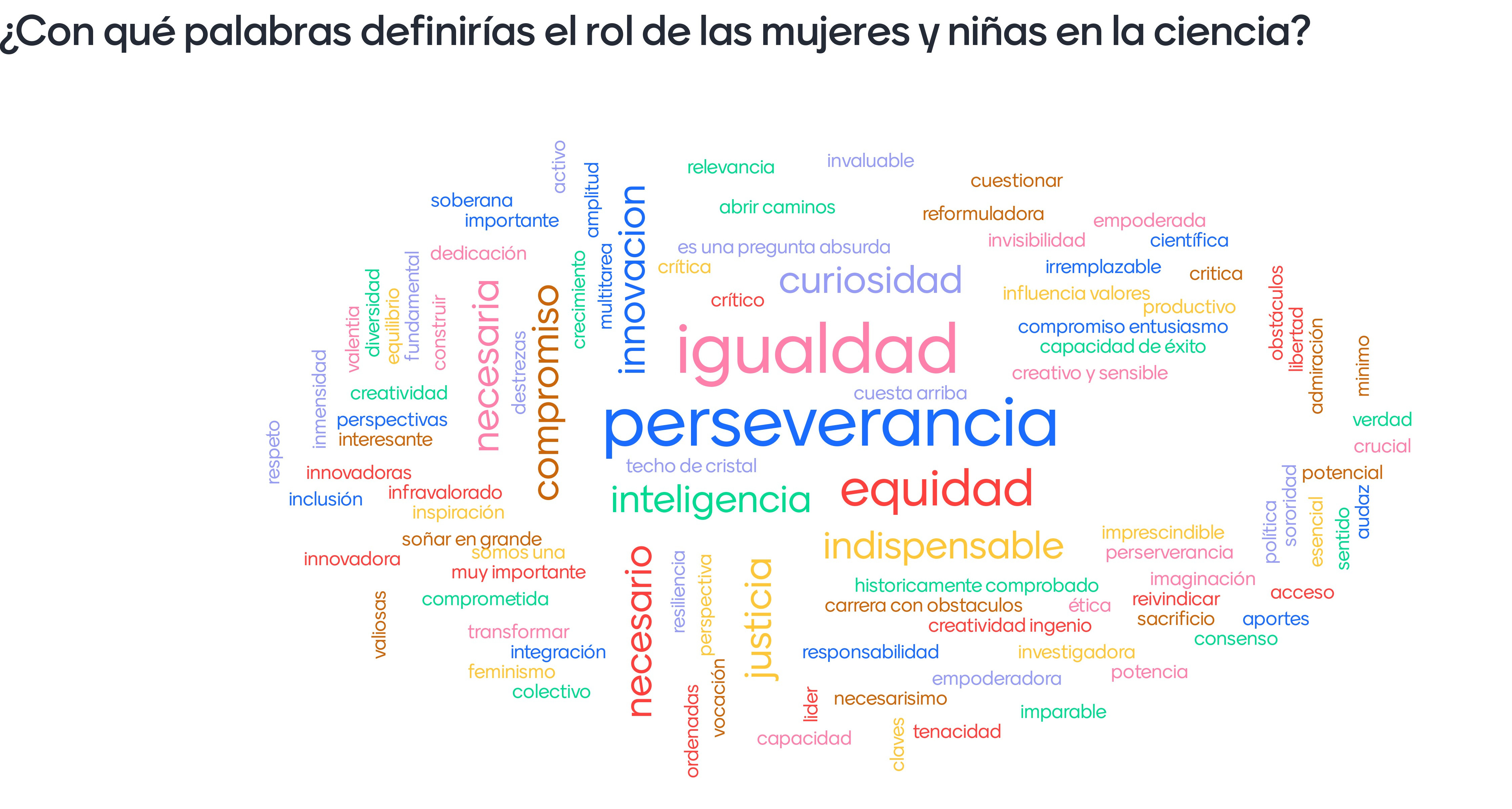 Para cerrar esta reflexión, destacamos dos palabras muy movilizantes que aparecen en la nube formada: "imaginación" y "curiosidad". La perspectiva de género en todos los ámbitos, incluido el científico, dispara nuestra capacidad para interrogarnos acerca de lo supuestamente “natural” y dado, puesto que no existen roles predeterminados ni destinos acabados, somos nosotras y nosotros quienes lo modelamos, con nuestras cotidianidades y las decisiones que tomamos en el día a día.