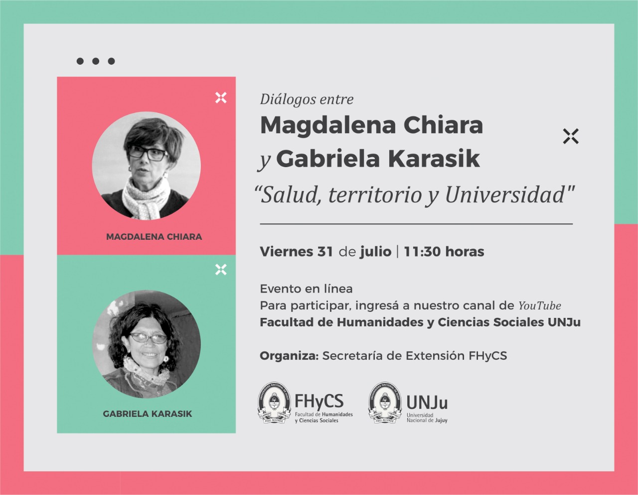 Gabriel Karasik, investigadora CIC de la UE CISOR, dialogará con Magdalena Chiara (UNGS) sobre Salud, Territorio y Universidad en el marco de una actividad organizada por Secretaría de Extensión de la Facultad de Humanidades y Ciencias Sociales (Universidad Nacional de Jujuy).
