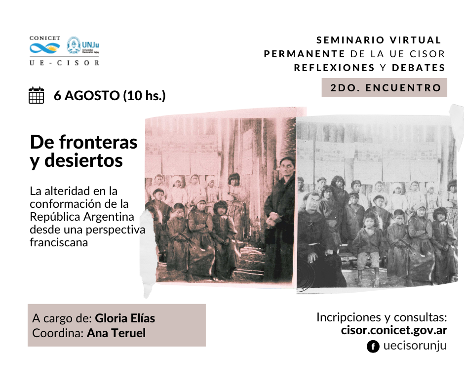 El segundo encuentro se desarrollará el 6 de agosto (10 hs.) y estará a cargo de la investigadora de la UE CISOR Gloria Elías, quien abordará un artículo de su autoría, titulado “De fronteras y desiertos. La alteridad en la conformación de la República Argentina desde una perspectiva franciscana” (Título original en portugués: “De fronteiras e desertos: a alteridade na conformação da República Argentina a partir de um olhar franciscano”). La lectura previa del texto es requisito para participar y posibilitar el debate. La discusión, en esta oportunidad, estará coordinada por la Dra. Ana Teruel (Inv. de CONICET en UE CISOR).